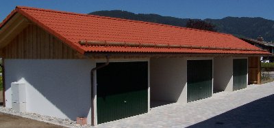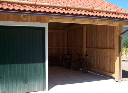 Auf der Nordseite stehen für jedes Ferienhaus je eine Garage und ein offener Abstellraum, der ggf. auch als 2. Garage verwendet werden kann, zur Verfügung und sind im Mietpreis inklusiv.
